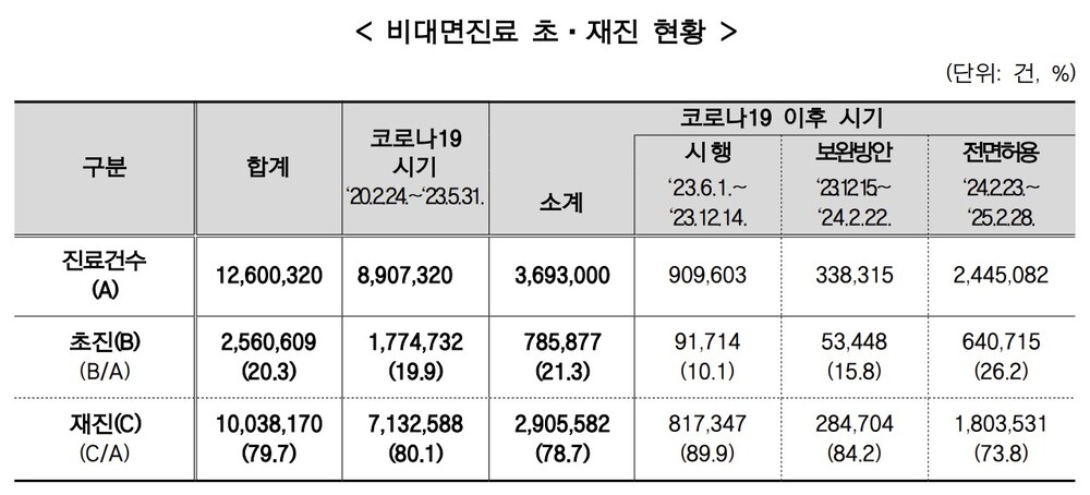 재진진료가 전체 비대면진료에서 차지하는 비율은 시기적으로 조금씩 차이가 있었으나 대체적으로 74~80% 범주였다. 비대면진료 중 약 15%는 휴일·야간에 이뤄져, 대면진료 약 8%보다 높았다. 연령별로는 20세 미만 이용 비율이 16% 내외, 65세 이상 이용 비율이 29% 내외였다.