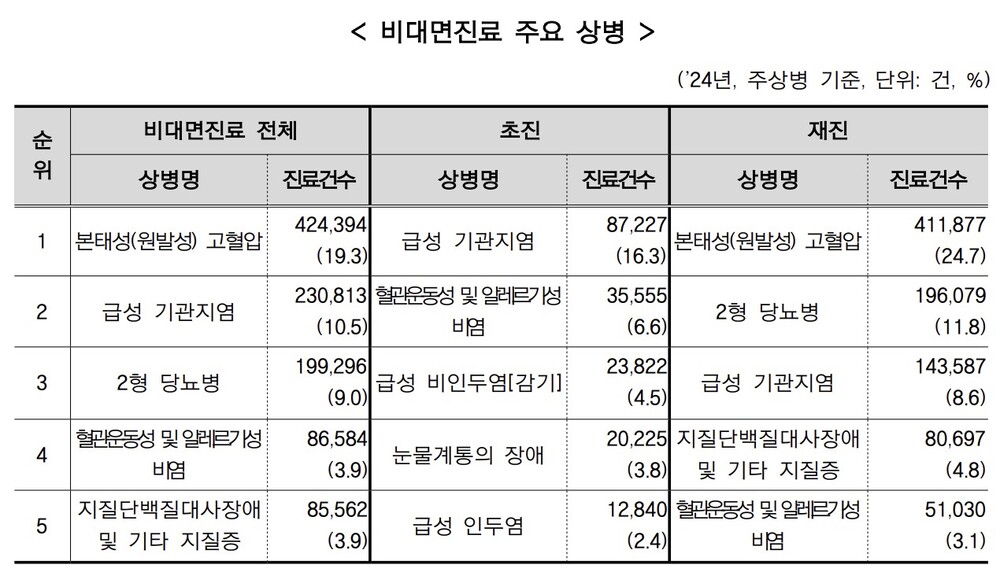 주요 상병은 지난해 의원급 의료기관을 기준으로 고혈압(19.3%), 기관지염(10.5%), 당뇨병(9.0%), 비염(3.9%) 등 만성질환·경증 위주였다. 초진 진료의 경우 기관지염(16.3%), 비염(6.6%), 감기(4.5%), 눈물계통 장애(3.8%) 등 경증 위주였고, 고혈압, 당뇨병 등 만성질환 비율은 전체·재진 진료에 비해 낮았다.