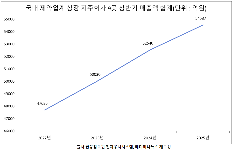 15일 금융감독원 전자공시시스템 자료에 따르면, 국내 제약업계 상장 지주회사 9곳 올해 상반기 매출액 합계는 5조4537억원이다. 전년 동기 5조2540억원과 비교 시 3.8%(1997억원) 늘어난 규모다.