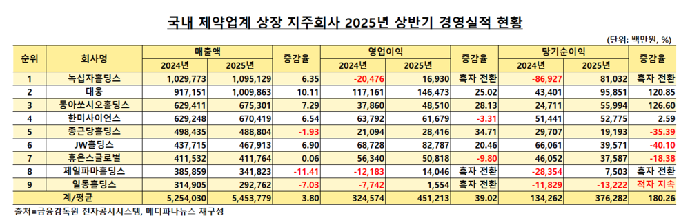 이같이 실적을 늘린 6곳과 달리, 나머지 3곳(제일파마홀딩스·일동홀딩스·종근당홀딩스)은 올해 상반기 매출액이 전년 동기와 비교해 감소했다.