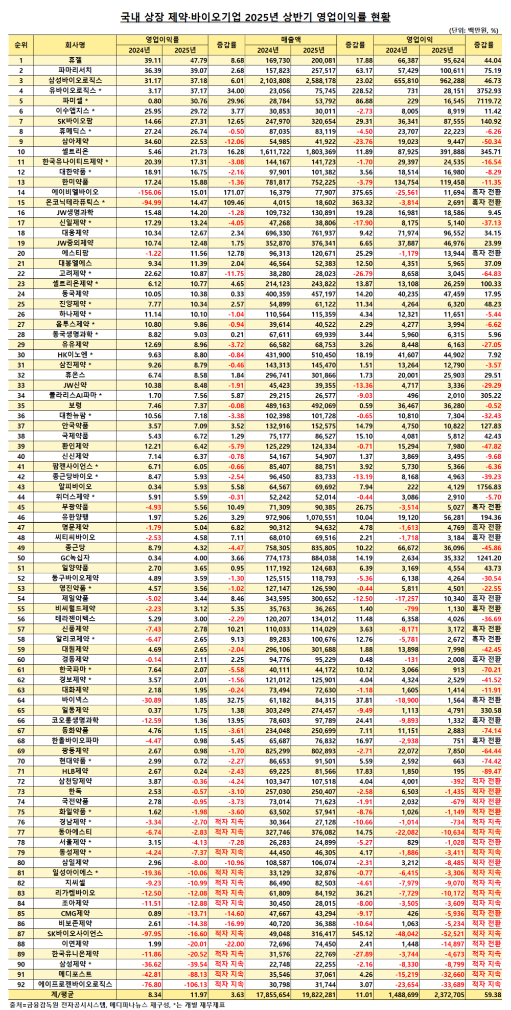 국내 상장 제약·바이오 기업 92곳 가운데 매출액 규모가 가장 큰 삼성바이오로직스는 상반기 영업이익률 순위를 지난해 4위에서 올해 3위로 한 단계 높였다. 이 기업 올해 상반기 영업이익률은 37.18%로 전년 동기 대비 6.01%p 늘었다.