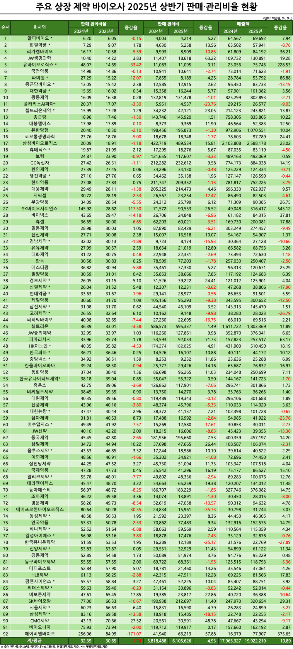 이번 상반기 수치는 '매출 성장에 따른 자연스러운 비율 개선'이 핵심 배경이다. 외형이 커질수록 판관비 증가 부담은 완화됐으며, SK바사·유바이오로직스 사례가 대표적이다.