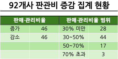 판관비율이 낮아진 기업은 46곳, 높아진 기업 역시 46곳으로 팽팽했다. 매출 확대가 판관비 증가 속도를 상회한 기업들은 개선을 이끌었고, 반대로 매출 둔화 또는 판관비 급증 기업은 효율이 악화됐다.