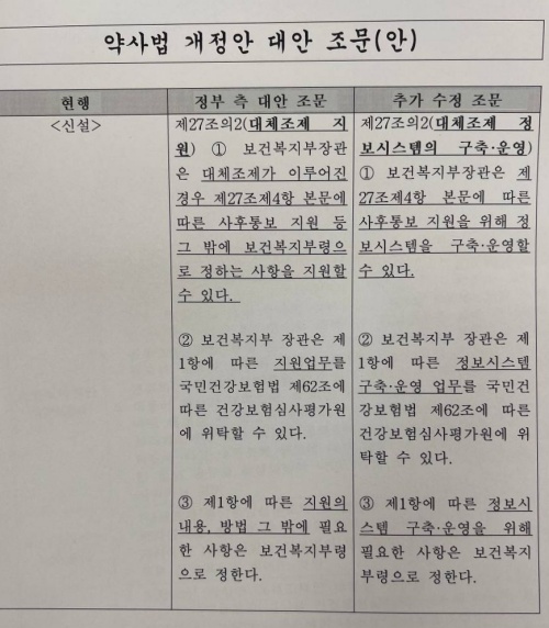 법안소위를 통과한 법안은 정부측이 대안 조문으로 내놓은 제27조의2 '대체조제 지원'을 '대체조제 정보시스템의 구축·운영'으로 추가 수정해 신설했다.