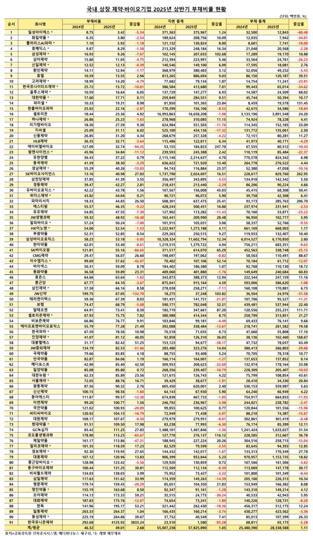 업체별 부채비율 증감을 보면, 국내 상장 제약·바이오기업 50곳은 지난 6월 말 부채비율이 전년 동기 대비 증가하며 91곳 부채비율 평균이 상승하는 데 영향을 미쳤다. 반면, 나머지 41곳 부채비율은 하락했다.