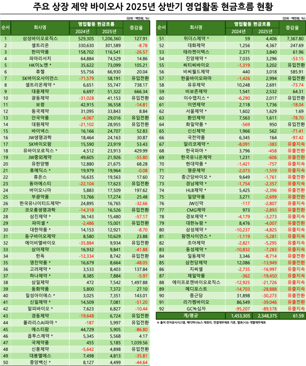 20일 메디파나뉴스가 전자공시시스템에 공시된 올해 상반기 반기보고서를 분석한 결과, 상장 제약·바이오기업 92개사의 영업활동 현금흐름 총액은 2조3484억원으로 집계됐다. 이는 지난해 상반기 1조4533억원 대비 61.59% 증가한 수치다.