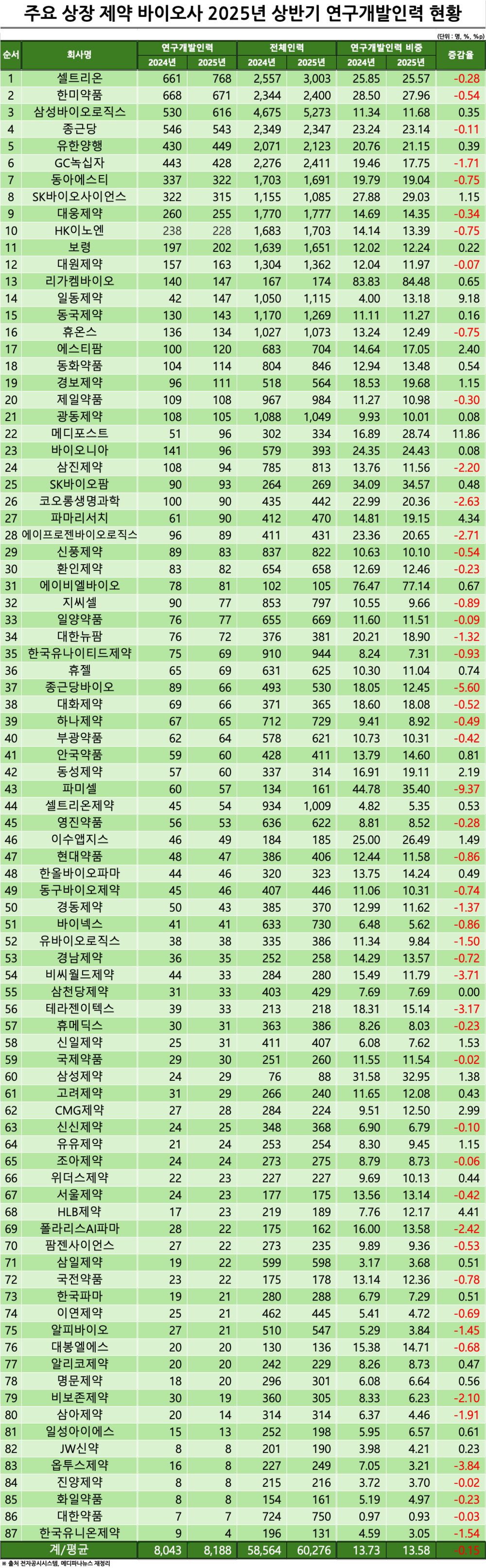 이 중 셀트리온은 전년 동기 대비 107명 늘어난 768명으로 연구개발인력 1위로 올라섰으며, 삼성바이오로직스도 전년 대비 86명 증가해 종근당(543명)을 제치고 4위에서 3위로 올라섰다. 유한양행(449명)도 GC녹십자(428명)를 제치고 5위로 올라섰다.