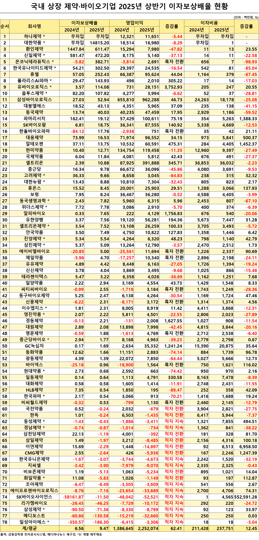 27일 메디파나뉴스가 공시 자료를 확인한 결과, 국내 상장 제약·바이오 기업 78곳 올해 상반기 이자보상배율 평균은 9.47배로 전년 동기 6.56배 대비 상승했다.