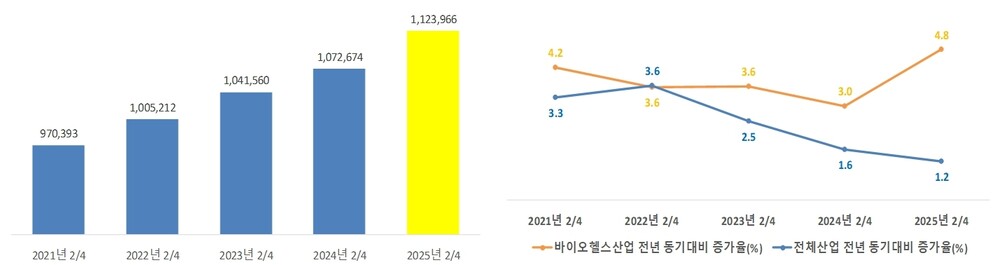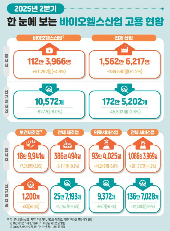 29일 한국보건산업진흥원(원장 차순도, 이하 진흥원)이 발표한 '2025년 2/4분기 바이오헬스산업 고용동향'에 따르면, 올해 2분기 바이오헬스산업 종사자 수는 총 112만4000명으로 집계됐다. 이는 전년 동기 대비 5만1000명 증가한 수치로, 전 산업 평균 대비 3.6%p 높다.