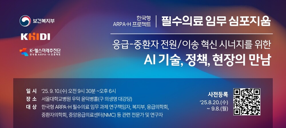 이번 심포지움은 오는 10일 오전 9시 30분부터 오후 6시까지 서울대병원 우덕 윤덕병홀에서 개최되며, 한국형 ARPA-H 필수의료 임무 과제 연구책임자, 복지부, 응급의학회, 중환자의학회, 중앙응급의료센터(NMC) 등 관련 전문가 및 연구자들이 참석한다.