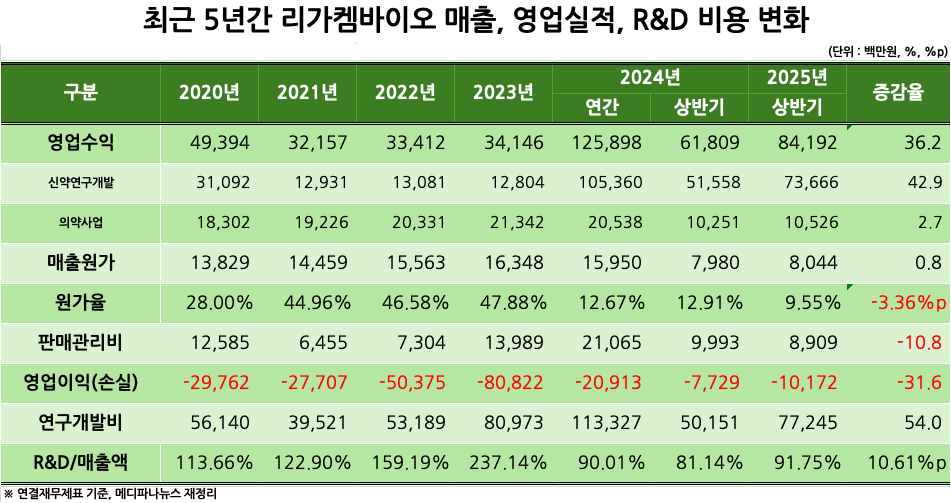 한편, 리가켐바이오는 올해 상반기 재무적으로 연구개발 확대에 따른 손실이 발생했다. 상반기 연결 기준 영업손실은 59억원, 당기순손실은 323억원으로 집계됐다. 다만 현금성 자산 1197억원과 기타 유동금융자산 4522억원을 포함해 총 6238억원의 유동자산을 확보하고 있어, 글로벌 임상 확대와 신규 과제 투자에는 무리가 없다는 입장이다.