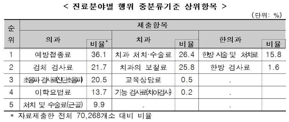진료하는 의료기관이 많은 항목은 중분류 기준 의과는 예방접종료(36.1%), 치과는 처치·수술료(26.4%), 한의과는 한방시술 및 처치료(15.8%)가 기관 수 상위를 차지했다.