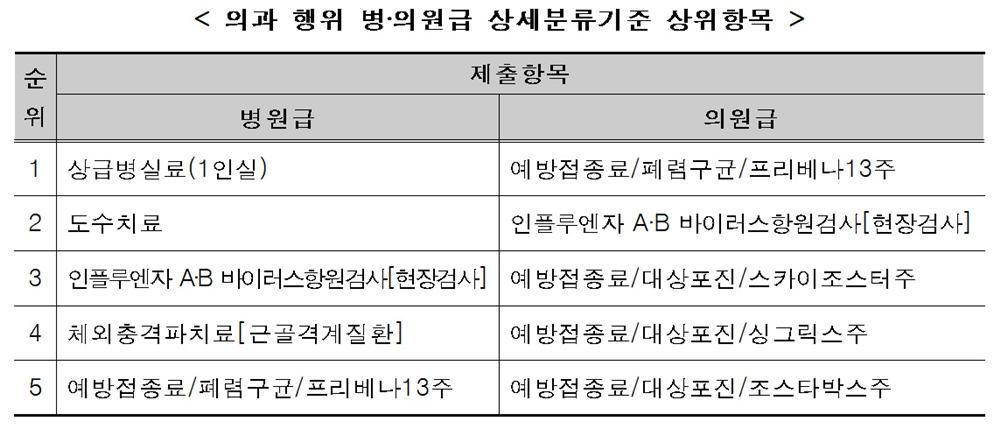 상세분류 기준 상위 항목에서 의과 병원급은 상급병실료와 도수치료가 의료기관 수에 있어 상위를 차지했다. 의원급은 예방접종료가 상위를 차지했다.