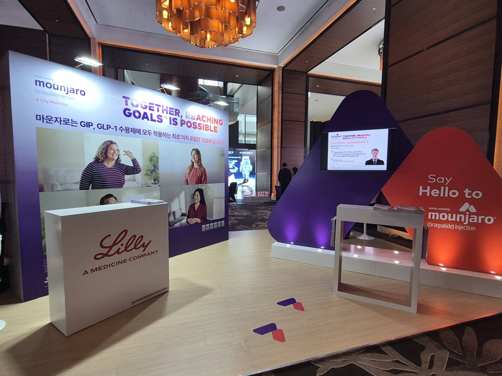 반면 한국릴리는 마운자로 부스 내 대형 조형물을 설치했다. 높이가 약 3미터에 달하는 로고 조형물을 통해서 비로소 마운자로가 국내 모습을 드러냈다는 점을 강조했다. 안내 데스크를 비롯한 전체 부스 색상 역시 마운자로 관련 색상인 보라색과 빨간색에 포인트를 줘 통일감을 선사했다.