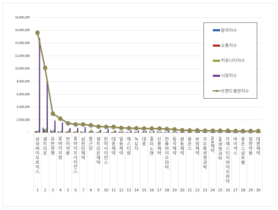제약 상장기업 브랜드평판 1위를 기록한 삼성바이오로직스 브랜드는 참여지수 261,098 소통지수 225,467 커뮤니티지수 358,893 시장지수 14,791,353이 되면서 브랜드평판지수 15,636,811로 분석됐다. 지난 8월 브랜드평판지수 16,330,651과 비교해보면 4.25% 하락했다.