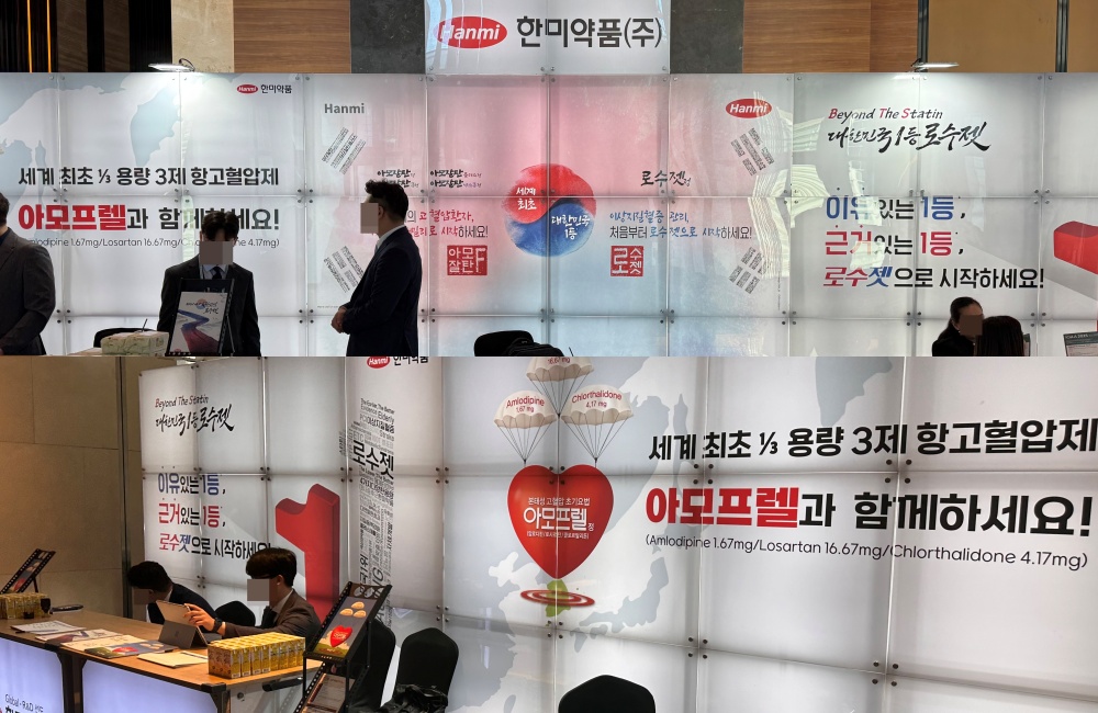 특히 중앙에 위치한 3개 부스에선 회사 매출에서 가장 큰 비중을 차지하는 고지혈증 치료제 '로수젯'이 2칸을 차지했고, 지난달 출시된 아모프렐이 함께 배치됐다. 바로 옆에 붙은 1개 부스엔 고혈압 치료제 '아모잘탄' 패밀리가 배치됐다.