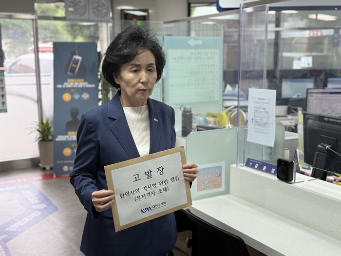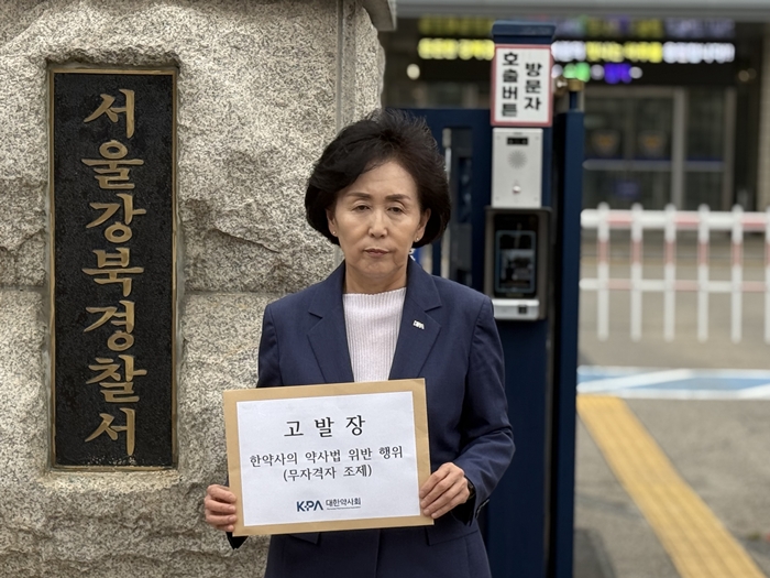 권영희 대한약사회장과 유성호 사무총장, 노수진 총무 겸 홍보이사는 16일 오전 강북경찰서를 방문해 일부 한약국에서 약사가 부재한 시간에 한약사가 처방전 내역을 직접 조제한 불법행위를 고발하는 고발장을 접수했다.