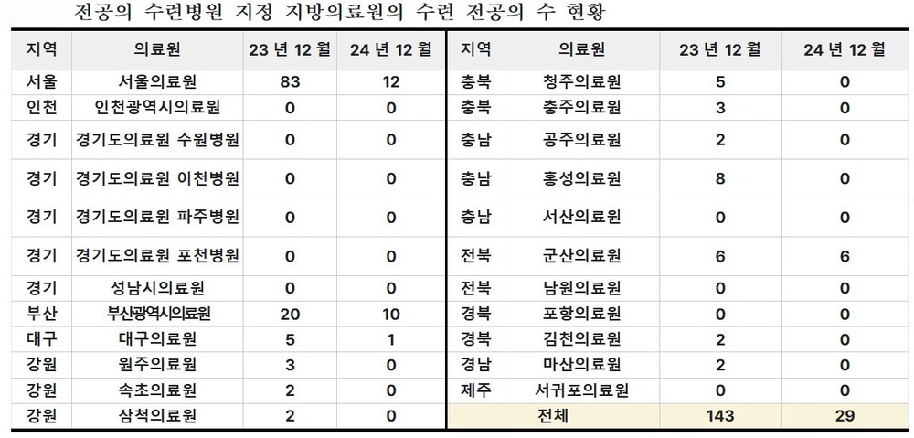 전공의 수련병원으로 지정된 전국 지방의료원 23곳의 전공의 정원이 2023년 143명에서 지난해 29명으로 80% 가량 급감한 것으로 나타났다. 특히 전공의가 0명인 지방의료원은 2023년 12월 기준 8곳에서 지난해 19곳으로 약 2배 이상 늘어난 것으로 확인된다.
