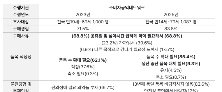 한편, 편의점 안전상비약의 구매 경험은 '약국이 문을 닫은 공휴일·심야시간 등 긴급 상황에서 필요해서'(68.8%) 등을 이유로 2023년 71.5%에서 2025년 83.8%로 꾸준히 증가하고 있었다. 응답자 10명 중 9명이 편의점 안전상비약 구입으로 긴급하고 일상적인 약 수요에 실질적인 도움을 얻었다고 답해 제도 도입 목적이 효과적으로 구현되고 있음을 확인했다.