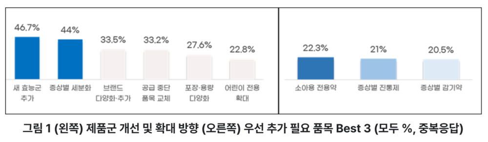 세부적으로는 ▲소아용 전용약(22.3%) ▲증상별 진통제(21.0%) ▲증상별 감기약(20.5%) 순으로 확대 요구가 높게 나타나, 지난 조사에서 확인된 주요 개선 요구가 여전히 유효함을 확인했다.