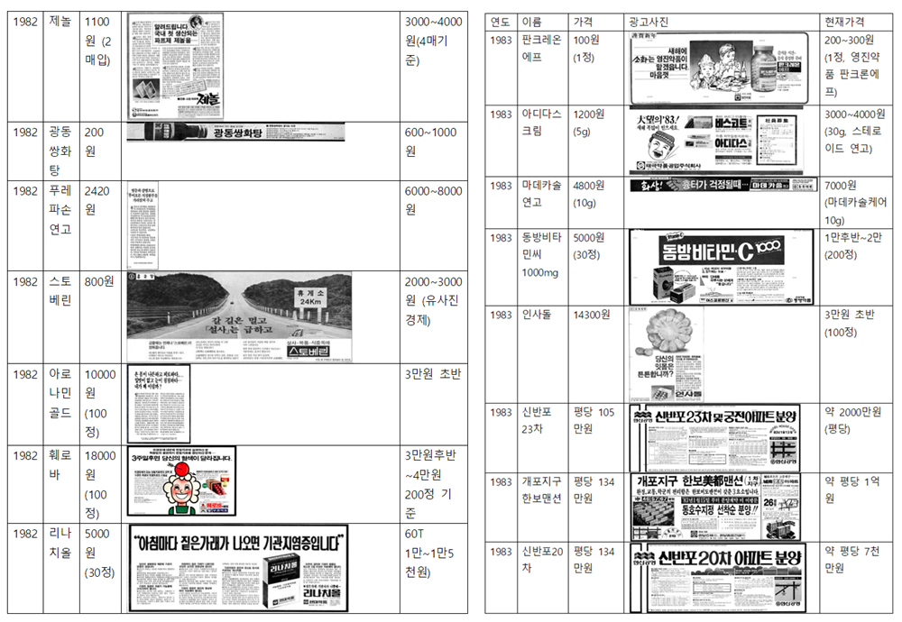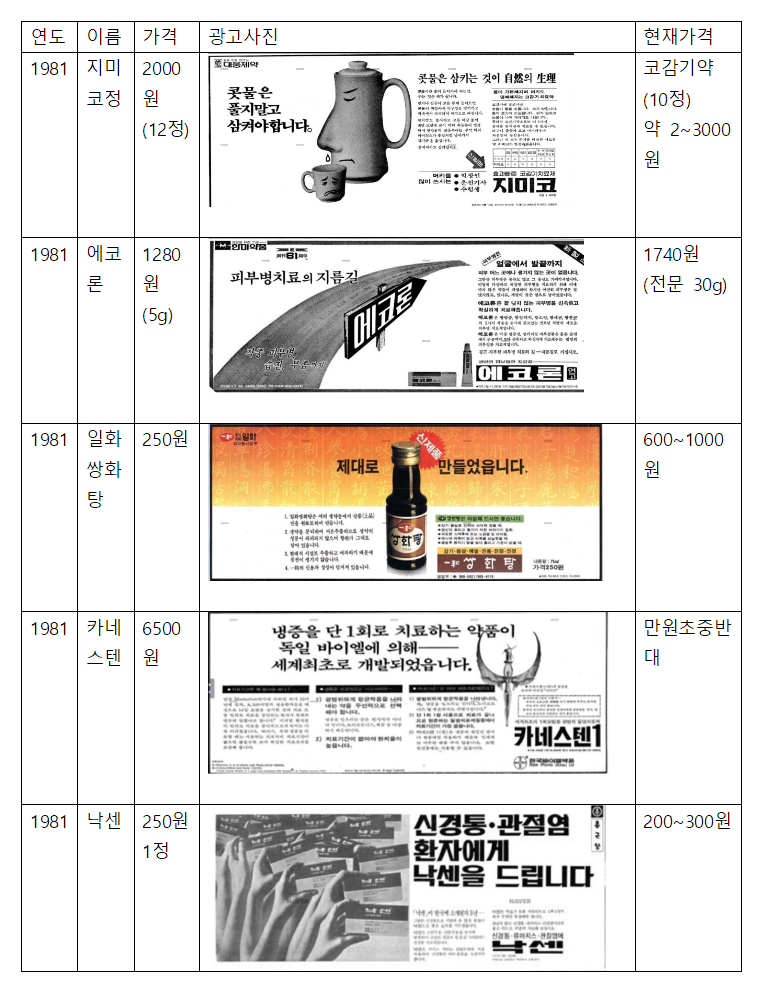 1982년 2장에 1100원이었던 파스류의 가격, 콧물약 역시도 12정에 2000원에 판매되고 있으며, 100정 기준 1만8000원에 판매된 훼로바정은 현재 200정 기준 3만원 후반~4만원대로 동일품목의 현재 가격과 큰 차이가 나지 않는다.