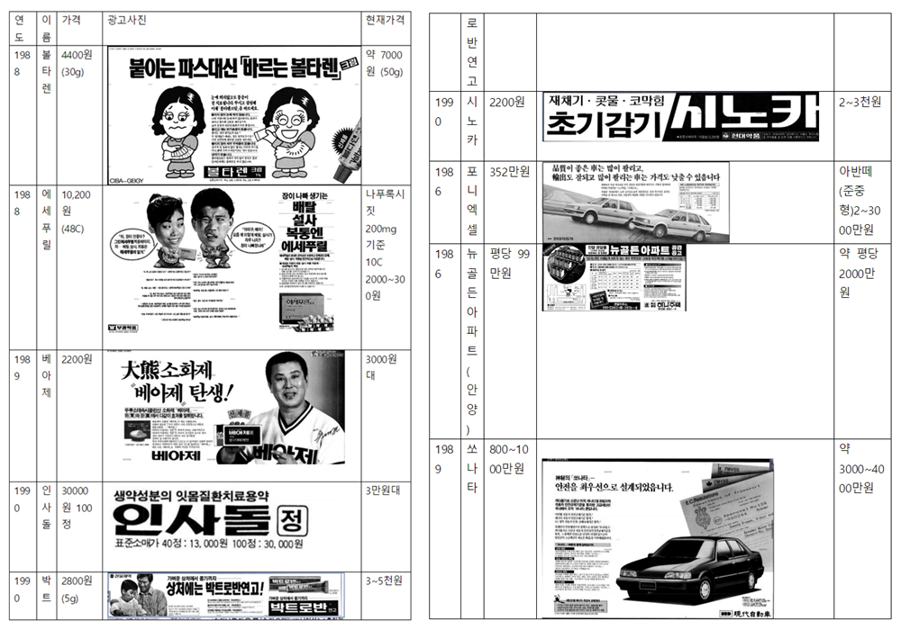 1979년부터 1998년까지의 신문 광고 자료를 분석해 의약품 가격 변동을 조사한 결과, 낙센정·파스류·감기약·인사돌 등 다수의 일반의약품은 수십 년 동안 가격이 거의 변하지 않았거나 오히려 과거 가격이 더 비싼 것으로 나타났다.
