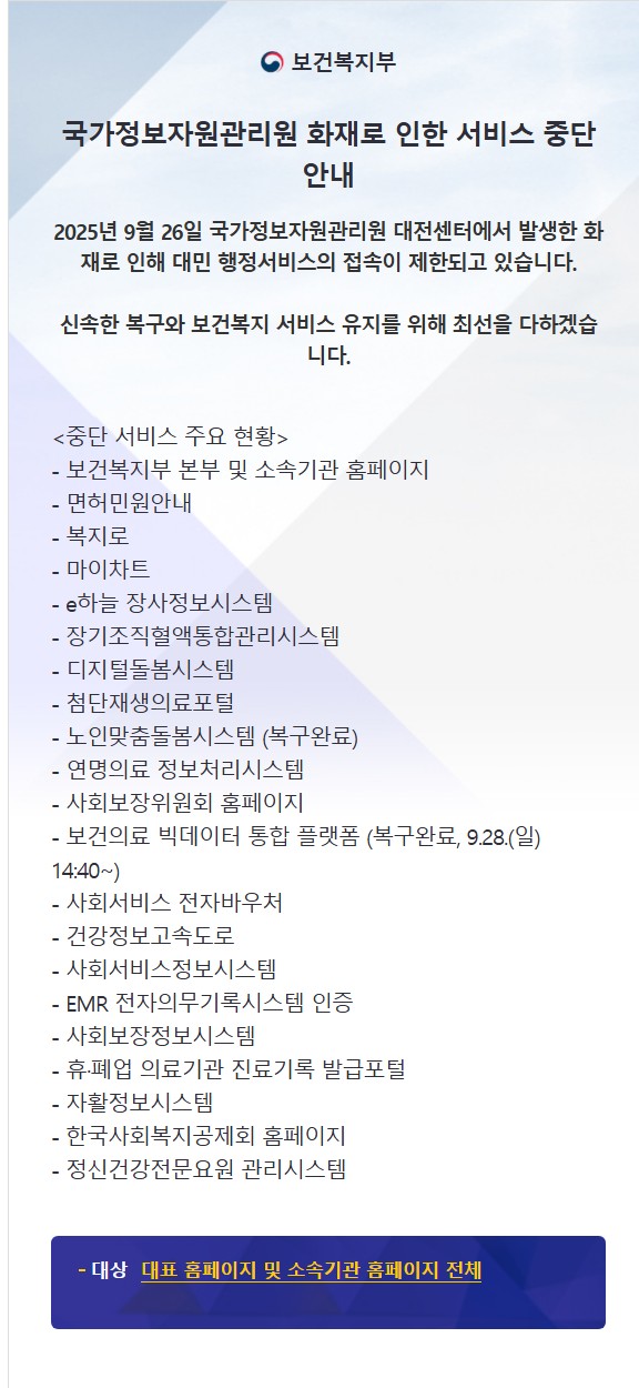 보건복지부는 복구가 늦어지는 홈페이지 등에는 서비스 중지를 안내했고, 전소로 인해 상당기간 정상적인 서비스 제공이 어려울 것으로 예상되는 사회서비스전자바우처시스템, e하늘장사정보시스템 등과 관련된 업무에 대해서는 대체 행정절차 수립 등 업무연속성 확보 방안들을 촘촘하게 논의했다.