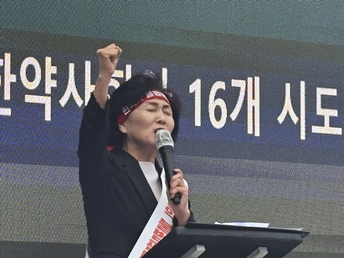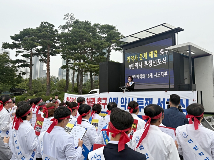 이날 권영희 회장은 투쟁 선포문을 통해 "한약사 제도는 본래 '한방분업'을 전제로 '한약 조제'를 위해 만들어진 제도였다"며 "하지만 한방분업은 온데간데 없고, 약사들은 한약 조제권을 빼앗긴 것도 모자라, 이제는 한약사가 종합병원 앞에서 전문의약품 조제 약국을, 심지어 창고형 약국까지 개설하는 참담한 모습을 목도하게 됐다. 정부의 무책임한 방치 속에 이 제도는 본래의 목적을 완전히 상실한 채 변질됐다"고 지적했다.