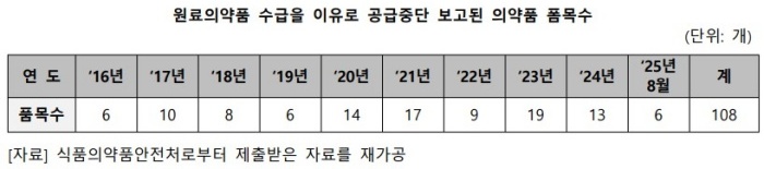 국회 보건복지위원회 소속 더불어민주당 박희승 의원이 식품의약품안전처로부터 제출받은 자료를 분석한 결과, 2016년부터 올해 8월까지 최근 10년간 총 108개의 의약품이 원료의약품 수급을 이유로 공급이 중단됐다. 올해 상황이 다소 개선되긴 했으나, 8월 기준 6개의 의약품이 공급중단 상태였다.