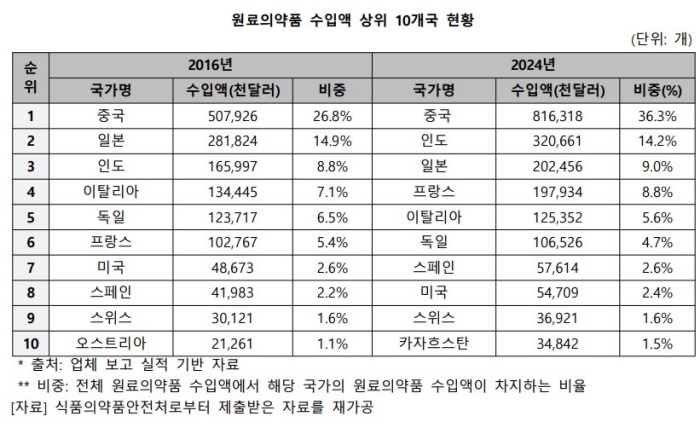 이런 상황에서 특정 국가에 대한 수입 집중도가 매우 높게 나타났다. 특히 가격 경쟁력을 앞세운 중국, 인도에 과도하게 의존하고 있는 것으로 확인된다. 원료의약품 수입액 상위 10개국 분석 결과2016년 중국의 원료의약품 수입액은 26.8%, 인도는 8.8%로 중국, 인도 2개 국가에서 수입하는 원료의약품 수입액 비중이 35.6%였지만, 지난해에는 중국(36.3%), 인도(14.2%) 2개국가가 차지하는 비중이 50.5%로 대폭 높아졌다.