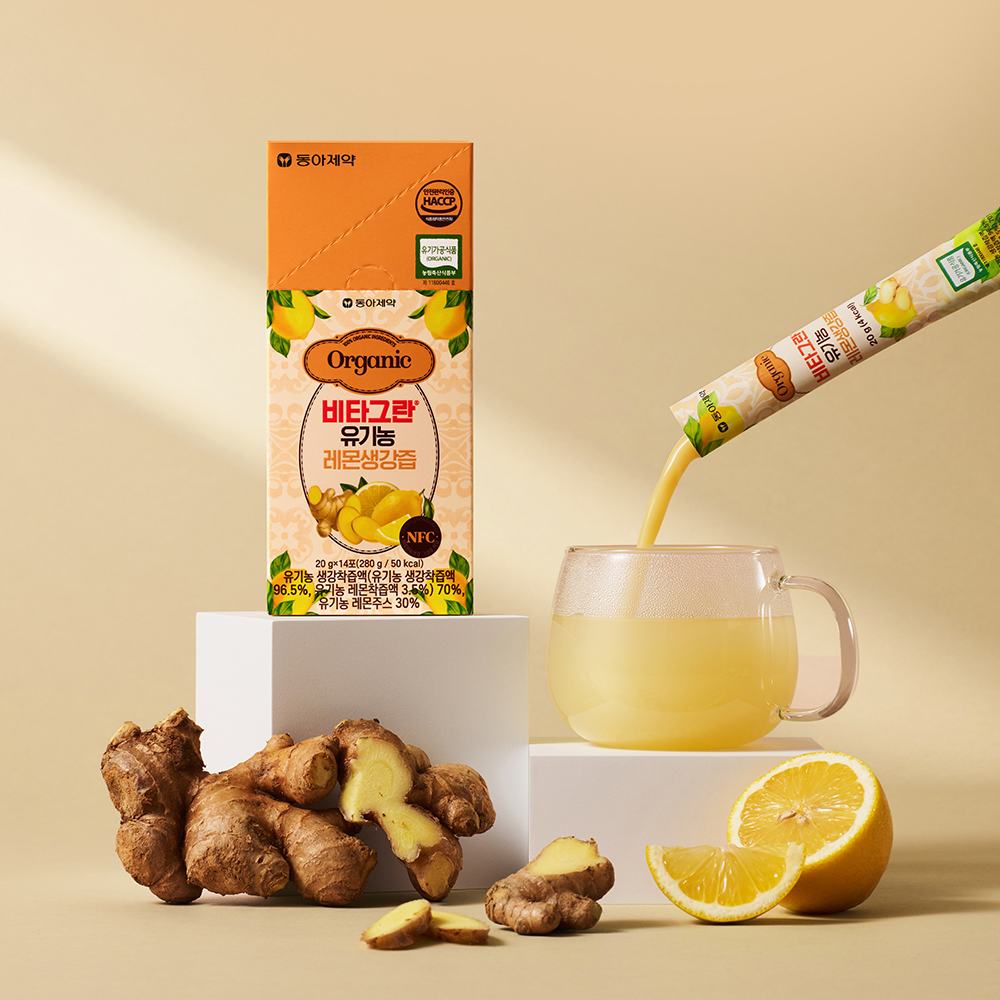 동아제약은 이러한 트렌드를 반영해 개별 스틱형 파우치로 간편하고 위생적으로 섭취할 수 있는 '비타그란 유기농 레몬생강즙'을 선보였다. 제품은 따뜻한 물 200ml에 타서 레몬생강차로 즐기거나, 탄산수와 섞어 상큼한 레몬진저에이드로도 활용할 수 있다.
