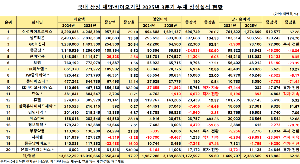3분기 누적 영업익·순이익 증가…삼성바이오로직스·셀트리온 영향 커