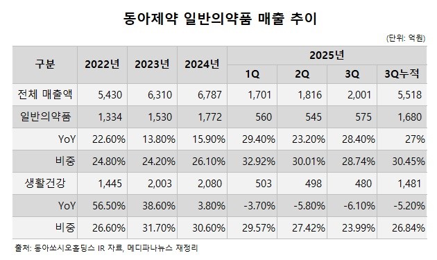 반면 일반의약품 부문 비중은 2023년 24.2%에서 지난해 26.1%로 확대됐고, 올해는 3분기 누적 매출 기준 30.4%까지 증가하며 생활건강과 자리를 맞바꿨다.