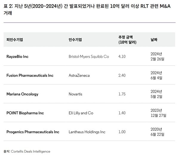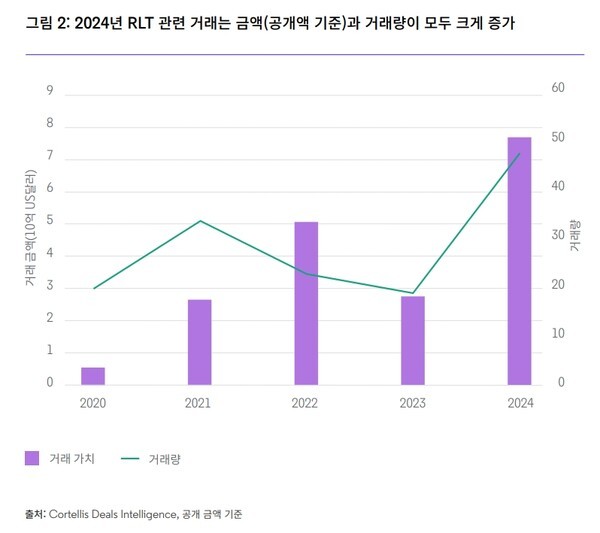 또한 클래리베이트 데이터에 따르면, 2020~2024년 동안 완료된 10억달러 이상 RLT 관련 M&A는 15건으로, 그 전 5년 간 9건이었던 데 비해 약 2배 증가했다.