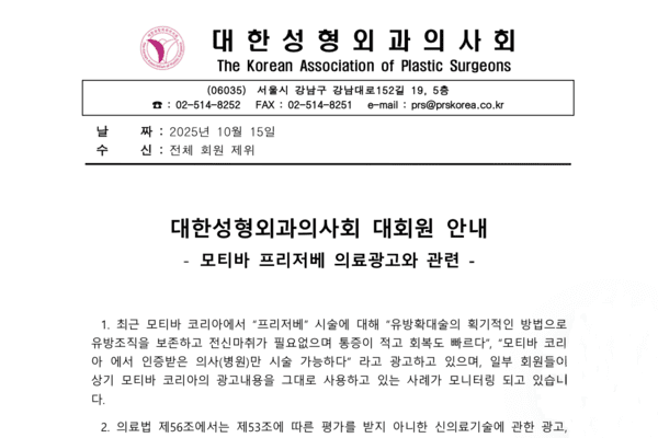 한편 대한성형외과의사회는 프리저베 시술과 관련된 과대·과장광고에 대해 모티바코리아 측에 정식으로 수정 요청을 한 것으로 알려졌다.