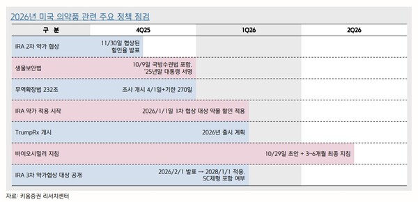 보고서 내용 중 내년 정책의 영향을 살핀 파트1 부분에 따르면, 30일 전까지 IRA 2차 약가 협상 대상 약물의 최종 가격 발표가 예정된 가운데, 이를 시작으로 생물보안법 올해 말 대통령 서명 예정, 내년 1월 1일 IRA 1차 협상 대상 약물 할인 적용, TrumpRx 내년 1분기 중 시행, 내년 2분기 중 바이오시밀러 규제 완화 최종 지침 발표, 관세 불확실성 해소 등 불확실했던 기존 정책들의 일정이 가시화되고 있다.
