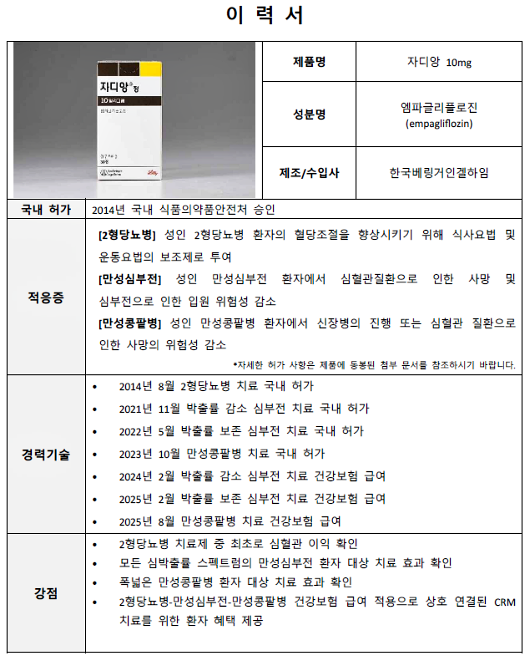 국내에서는 2014년 성인 제2형 당뇨병 환자의 혈당을 조절하는 치료제로 허가 받은 이후, 2015년에 2형 당뇨병 치료제 최초로 심혈관 이익을 확인하면서 심장-신장-대사질환(Cardiovascular-Renal-Metabolism, CRM)을 통합적으로 관리할 수 있는 가능성을 열었습니다.