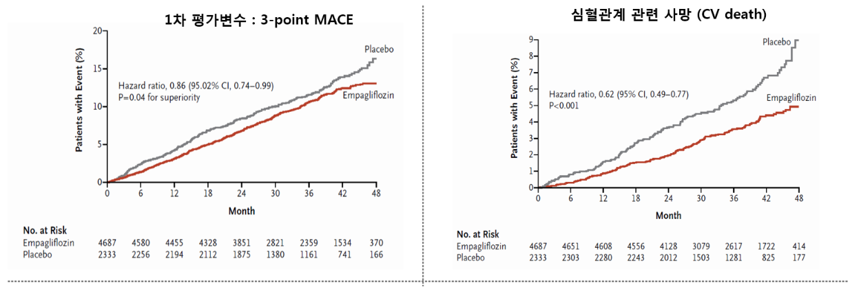 이러한 FDA 지침에 따라 진행된 EMPA-REG OUTCOME 연구에서 저는 안전성 이상의 놀라운 결과를 보였습니다. 연구 결과, 주요 심혈관계 발생 위험은 14%, 심혈관계 사망 위험은 38% 감소시키는 결과를 확인해 혈당을 조절하면서 심혈관 위험을 감소시킬 수 있는 약제로 거듭날 수 있었던 것이죠.